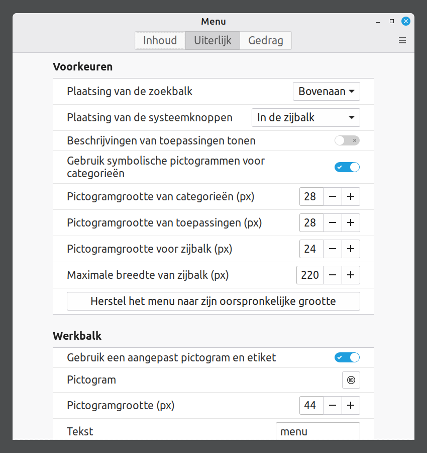 Je kunt het menu groter of kleiner maken door aan de randen te slepen.